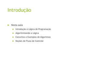 O capítulo 1 introduz a lógica de programação, essencial para o desenvolvimento de softwares, que permite organizar o raciocínio em sequências lógicas para solucionar problemas. Exemplos práticos, como trocar lâmpadas, ilustram o conceito de algoritmos através de sequências e decisões. O documento também discute formas de representação de algoritmos, incluindo fluxogramas e português estruturado, destacando vantagens e desvantagens de cada método.