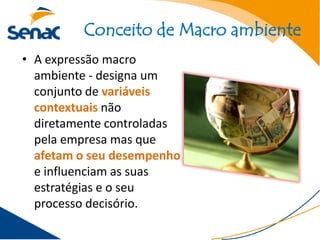 O documento aborda o conceito de macro ambiente, que consiste em fatores externos que afetam o desempenho das empresas, incluindo aspectos econômicos, políticos, sociais, naturais e tecnológicos. Destaca a importância do rastreamento de mudanças no mercado para a formulação de estratégias de marketing. A interação com stakeholders e a responsabilidade social também são enfatizadas, além do papel do marketing verde e da ética nas práticas comerciais.