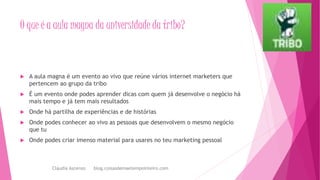 O documento descreve (1) o que é uma aula magna da universidade da tribo, que é um evento ao vivo onde marketers online aprendem dicas e compartilham experiências; (2) o que é a universidade da tribo, que ensina marketers a desenvolver seu negócio online em grupos de trabalho; (3) para a autora, o mais importante no evento é conhecer as pessoas e aprender dicas, especialmente por poder levar seus filhos.