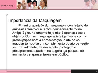1) A maquiagem tem como objetivos embelezar e proteger a pele. 2) Os principais produtos para uma maquiagem natural incluem corretivo, base, pó e sombras nos tons da pele. 3) Uma boa higienização é essencial para uma aplicação perfeita e um resultado duradouro.