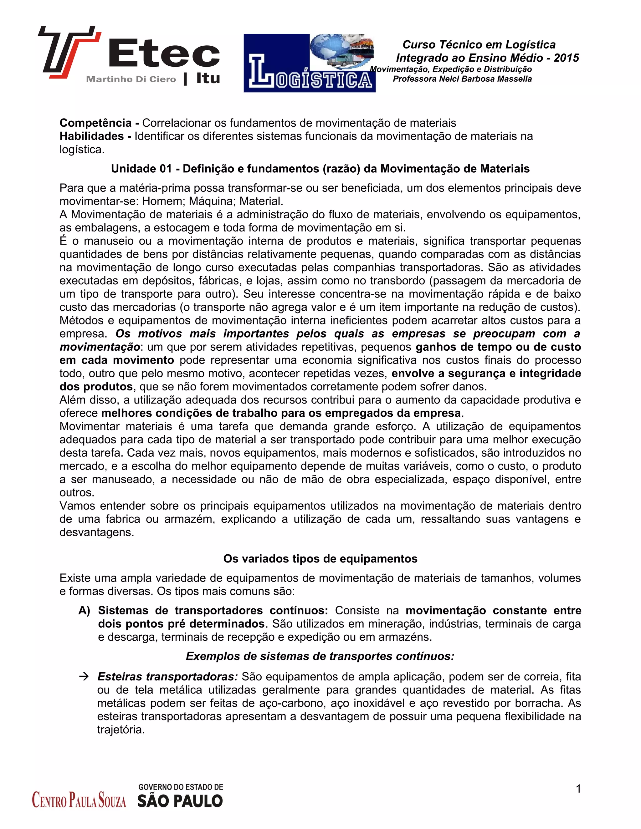O documento discute os fundamentos e equipamentos utilizados na movimentação de materiais em logística. Apresenta os principais sistemas de transporte contínuo como esteiras transportadoras e transportadores de roscas. Também descreve sistemas para áreas restritas como pontes rolantes e empilhadeiras para movimentação em locais sem limites fixos. Realça a importância de analisar custo-benefício e produtividade ao escolher os equipamentos.
