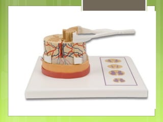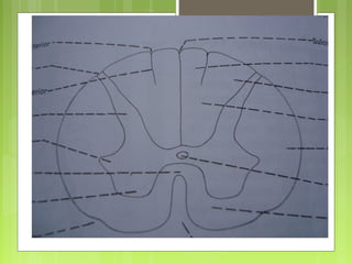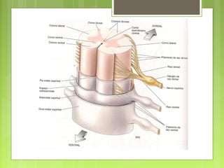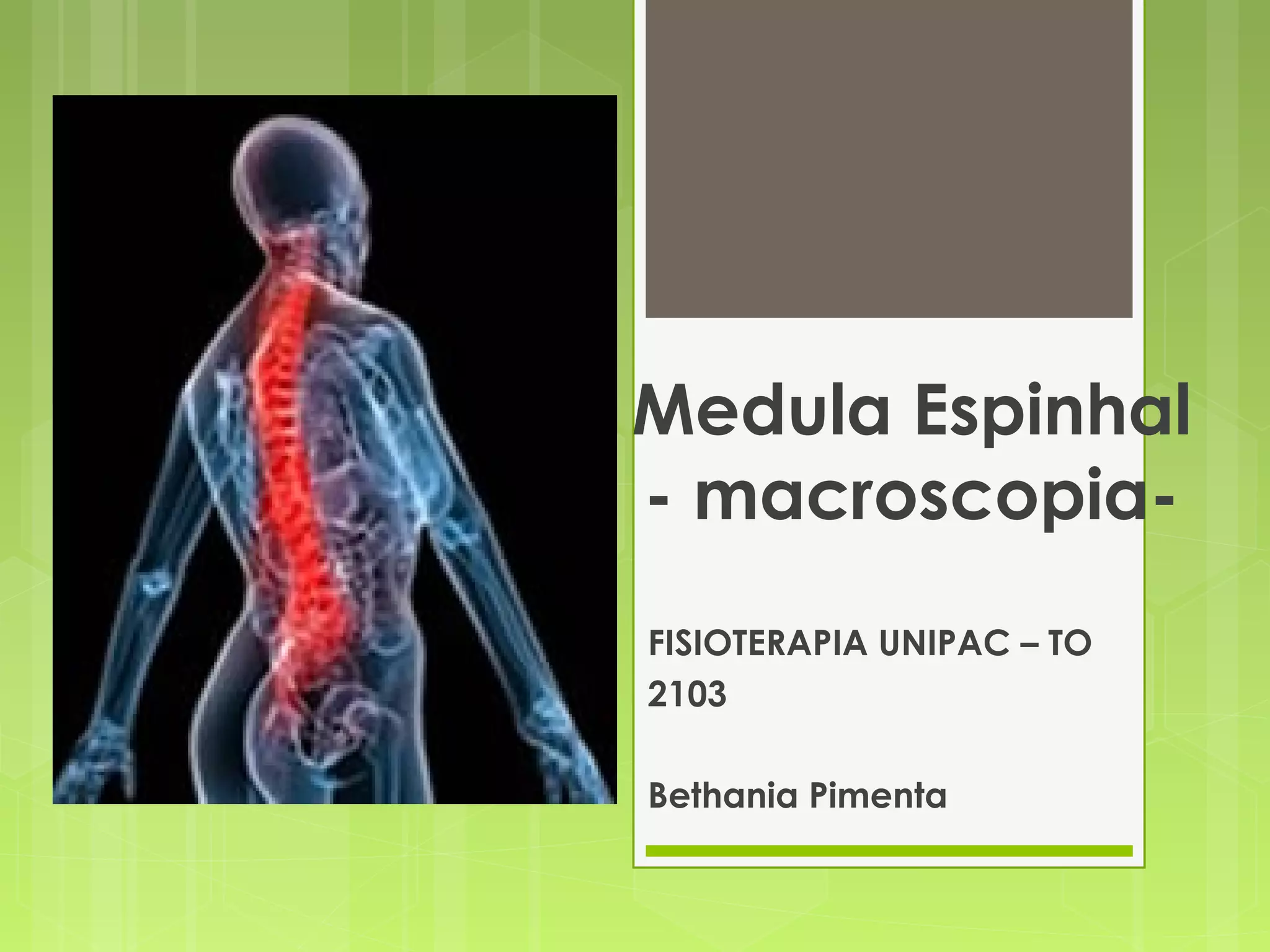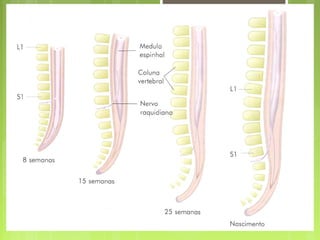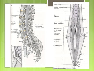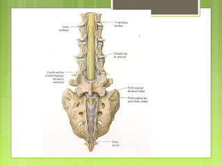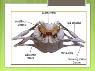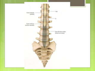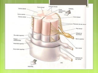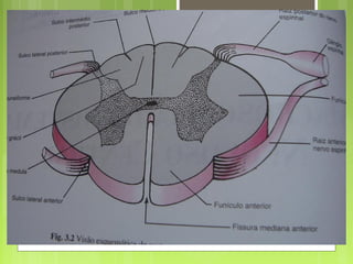 O documento descreve a anatomia da medula espinhal, incluindo sua localização e tamanho, subdivisões internas de substância cinzenta e branca, nervos espinhais, envoltórios medulares e espaços anatômicos ao seu redor. A medula espinhal é o órgão mais simples do sistema nervoso central, localizado dentro do canal vertebral, medindo cerca de 45 cm de comprimento no homem adulto.