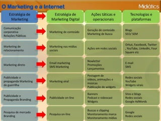 O documento apresenta uma análise sobre a evolução e o impacto da publicidade na internet, destacando que os investimentos em mídia digital superaram os meios tradicionais, exceto a TV. Além disso, discute o perfil dos usuários brasileiros e as diversas formas de divulgação online, incluindo e-mail marketing, banners e redes sociais. Também menciona as vantagens e desvantagens da publicidade na internet e as tendências futuras do mercado.