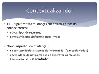 O documento fornece um resumo sobre metadados, incluindo: (1) Uma breve história do termo "metadados"; (2) Definições de metadados e como eles podem variar entre domínios; (3) Funções importantes de metadados como descrever recursos e facilitar a recuperação.
