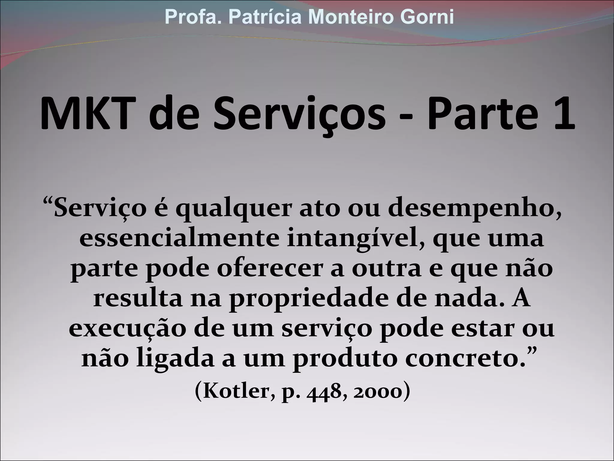 O documento discute as características principais dos serviços. Define serviço como qualquer ato ou desempenho essencialmente intangível oferecido por uma parte a outra. Explora a importância crescente do setor de serviços na economia e sociedade. Também descreve as quatro principais características dos serviços: intangibilidade, inseparabilidade, heterogeneidade e perecibilidade.
