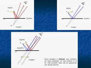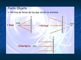 O documento descreve os principais conceitos da óptica geométrica, incluindo a propagação da luz, fontes de luz, interação da luz com meios materiais, fenômenos ópticos como reflexão e refração, e formação de imagens em espelhos planos.