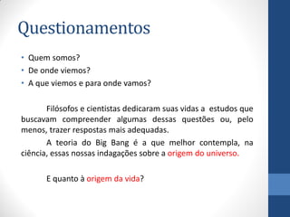 O documento discute as principais teorias sobre a origem da vida na Terra. De acordo com a teoria de Oparin, a vida teria surgido a partir da combinação de moléculas como metano, amônia e vapor d'água na atmosfera primitiva, levando à formação de proteínas e dos primeiros coacervados e células. Experimentos de Miller apoiaram a ideia de que aminoácidos poderiam ser formados nessas condições. Atualmente acredita-se que os primeiros seres teriam sido quimiolotoautot