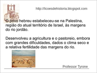 O documento descreve a história dos hebreus, desde sua origem na Palestina por volta de 2000 a.C., até a formação do Estado de Israel em 1948. Apresenta eventos significativos como o Êxodo liderado por Moisés, a unificação das tribos sob a monarquia de Saul, Davi e Salomão, e os conflitos subsequentes com potências estrangeiras. O texto também aborda questões contemporâneas relacionadas ao conflito árabe-israelense e a luta pela criação de um estado palestino.