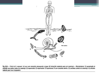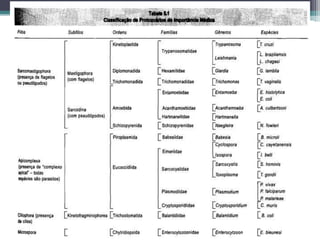 O documento resume conceitos fundamentais de epidemiologia e parasitologia, incluindo classificações de doenças, ciclos de vida de parasitas e formas de transmissão e prevenção. Aborda especificamente leishmanioses, doença de Chagas, malária, giardíase e outras parasitoses comuns.