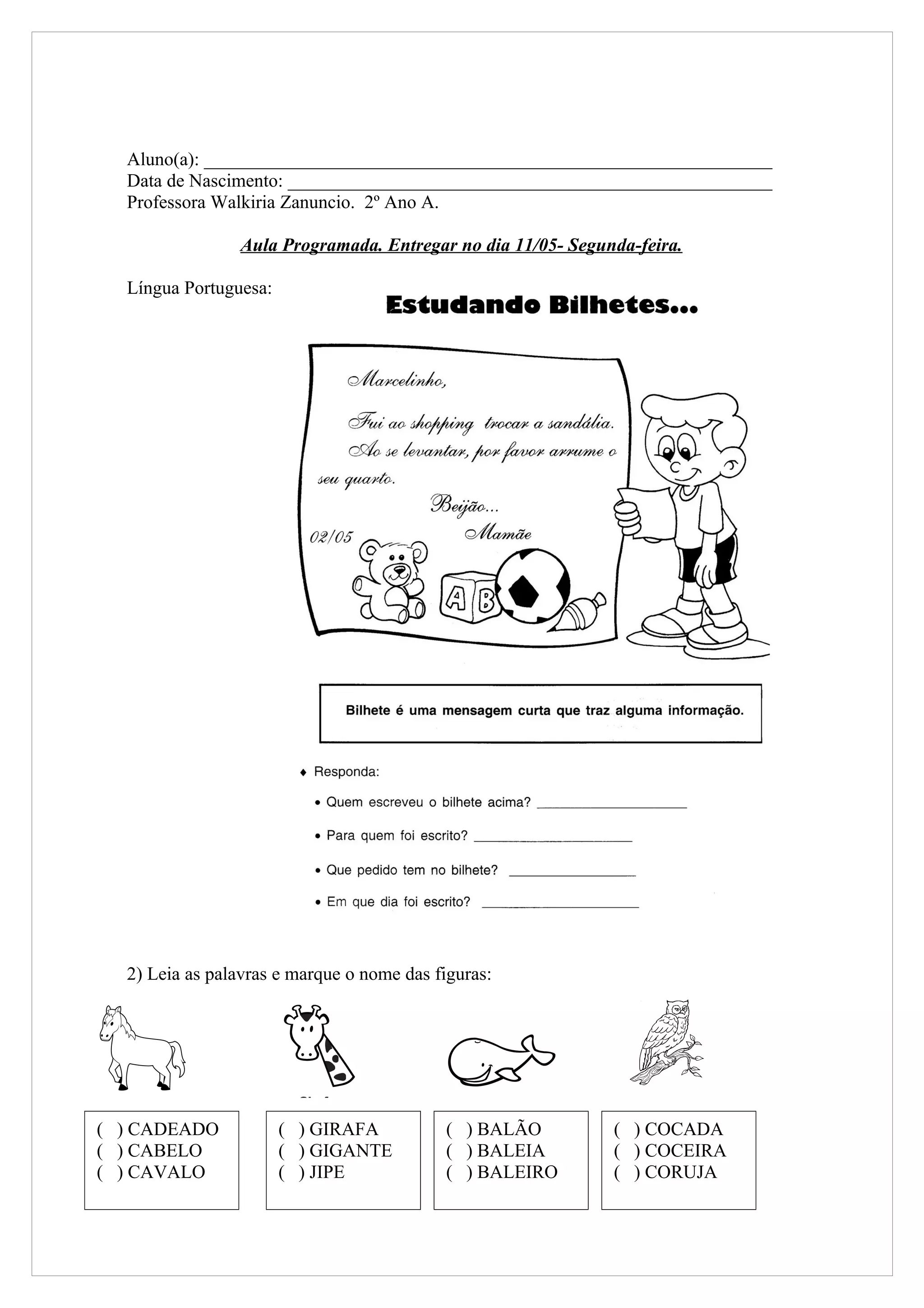 Este documento fornece instruções para uma tarefa de Português e Matemática para um aluno do 2o ano. Na Português, pede-se para marcar nomes de figuras de linguagem. Na Matemática, há um gráfico sobre frutas consumidas por Joana e questões relacionadas a ele.