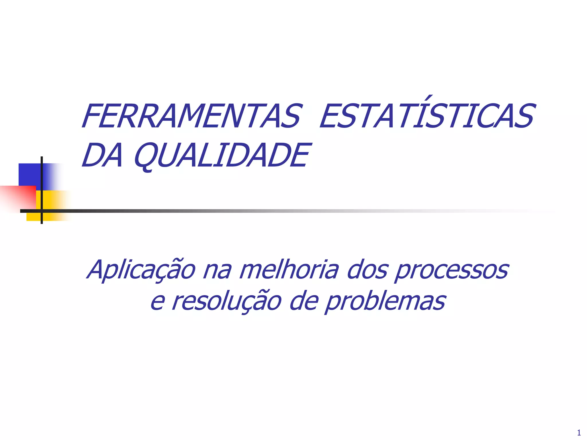Este documento descreve várias ferramentas estatísticas utilizadas para melhorar processos e resolver problemas, incluindo: (1) as 7 ferramentas básicas da qualidade como folhas de registro, histograma e diagramas de Pareto; (2) como usar esses ferramentas para coletar e analisar dados; e (3) objetivos gerais de facilitar a resolução de problemas para todos na empresa.