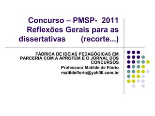 Este documento fornece reflexões gerais sobre questões dissertativas para o concurso PMSP de 2011. O texto discute eixos como educação de jovens e adultos, avaliação e sociedade tecnológica, e fornece exemplos de possíveis questões e respostas.