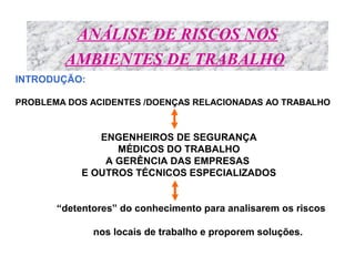 O documento discute a análise de riscos nos ambientes de trabalho. Apresenta os principais riscos físicos, químicos, biológicos, ergonômicos e mecânicos, além de riscos relacionados à organização do trabalho. Destaca a importância da participação dos trabalhadores no processo de identificação e controle de riscos, e a necessidade de adotar medidas de prevenção para promover a saúde e reduzir custos de produção.