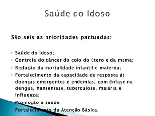 O documento descreve as diretrizes do Pacto pela Vida no Brasil, com foco na saúde do idoso. São definidas seis prioridades, incluindo a promoção do envelhecimento ativo e saudável. A avaliação do idoso deve ser multidimensional e abranger as dimensões física, mental e funcional. O acolhimento na atenção primária deve priorizar os casos de maior risco e fragilidade.