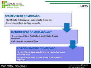 O documento discute a importância da segmentação de mercado, destacando a identificação de bases para segmentação, desenvolvimento de perfis de segmentos e a definição de mercados-alvo. Ele detalha diferentes estratégias de marketing, como marketing de massa, segmento, nicho e micromarketing, além de critérios para a segmentação eficaz. Elementos como características demográficas, psicográficas e comportamentais são abordados como fundamentais para a definição de segmentos de mercado.