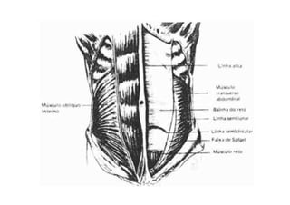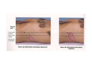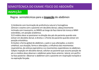 Este documento descreve a semiotécnica do exame físico do abdômen, incluindo a inspeção estática e dinâmica. A inspeção estática inclui a descrição da forma geral do abdômen e possíveis assimetrias, enquanto a dinâmica avalia movimentos respiratórios e pulsações. Exemplos clínicos ilustram abaulamentos devido a aneurisma de aorta abdominal gigante.