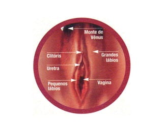 Sistema Reprodutor FemininoVulva A genitália externa ou vulva é delimitada e protegida por duas pregas cutâneo-mucosas intensamente irrigadas e inervadas - os grandes lábios. Na mulher reprodutivamente madura, os grandes lábios são recobertos por pêlos pubianos. Mais internamente, outra prega cutâneo-mucosa envolve a abertura da vagina - os pequenos lábios - que protegem a abertura da uretra e da vagina. Na vulva também está o clitóris, formado por tecido esponjoso erétil, homólogo ao pênis do homem.