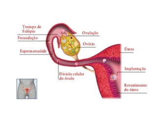 O documento descreve o sistema reprodutor masculino e feminino de forma detalhada, incluindo suas principais partes e funções, como a produção de gametas e hormônios, o ciclo menstrual e a ovulação.