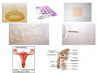 Sistema Reprodutor ContracepçãoNão ter relações sexuais - abstinência Evitar que um folículo se desenvolva - pílula anticoncepcional Colocar um obstáculo entre o espermatozóide e o óvulo - camisinha (masculina/feminina), DIU (dispositivo intra-uterino), diafragma Matar o espermatozóide - espermicidas Cirurgia - bloquear o espermatozóide ou óvulo com procedimentos cirúrgicos como ligadura das trompas (em mulheres) ou vasectomia (em homens) Tabelinha - evitar relações sexuais durante o período de máxima fertilidade