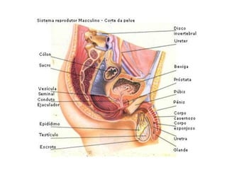 Sistema Reprodutor MasculinoGlândulas anexas: Próstata secreta substâncias alcalinas que neutralizam a acidez da urina e ativa os espermatozóides. Vesículas seminais responsáveis pela produção de um líquido, que será liberado no ducto ejaculatório que, juntamente com o líquido prostático e espermatozóides, entrarão na composição do sêmen. O líquido das vesículas seminais age como fonte de energia para os espermatozóides .