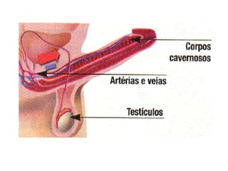 Sistema Reprodutor MasculinoPênis É considerado o principal órgão do aparelho sexual masculino, sendo formado por dois tipos de tecidos cilíndricos: dois corpos cavernosos e um corpo esponjoso (envolve e protege a uretra). Na extremidade do pênis encontra-se a glande - cabeça do pênis, onde podemos visualizar a abertura da uretra. Com a manipulação da pele que a envolve - o prepúcio - acompanhado de estímulo erótico, ocorre a inundação dos corpos cavernosos e esponjoso, com sangue, tornando-se rijo, com considerável aumento do tamanho (ereção). O prepúcio deve ser puxado e higienizado a fim de se retirar dele o esmegma (uma secreção sebácea espessa e esbranquiçada, com forte odor, que consiste principalmente em células epiteliais descamadas que se acumulam debaixo do prepúcio). Quando a glande não consegue ser exposta devido ao estreitamento do prepúcio, diz-se que a pessoa tem fimose.