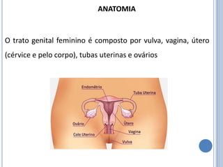 O documento descreve a anatomia e citologia normal do trato genital feminino, incluindo a descrição das células e tecidos encontrados na vulva, vagina, útero, tubas uterinas e ovários. É fornecida uma descrição detalhada dos diferentes tipos de epitélio e suas células (basais, parabasais, intermediárias e superficiais), bem como outras estruturas como leucócitos e bactérias.