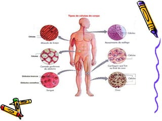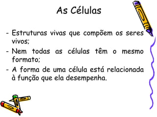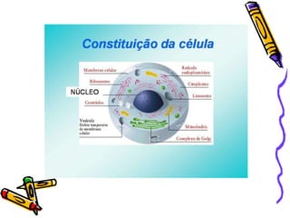 O documento descreve a descoberta da célula e sua estrutura básica. A célula foi primeiramente observada através do microscópio no século XVI e denominada por Hooke em 1665. O texto explica que a célula é a unidade estrutural e funcional dos seres vivos, podendo ser unicelular ou pluricelular, e contém organelas como a membrana, citoplasma e núcleo. Finalmente, classifica os organismos em procariotas e eucariotas.