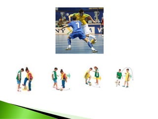 O documento discute a história e fundamentos do futsal, incluindo sua origem no Uruguai na década de 1930, o desenvolvimento das primeiras regras, e sua popularização no Brasil a partir da década de 1950. Também aborda conceitos técnicos e táticos como passes, dribles, chutes e esquemas de jogo.
