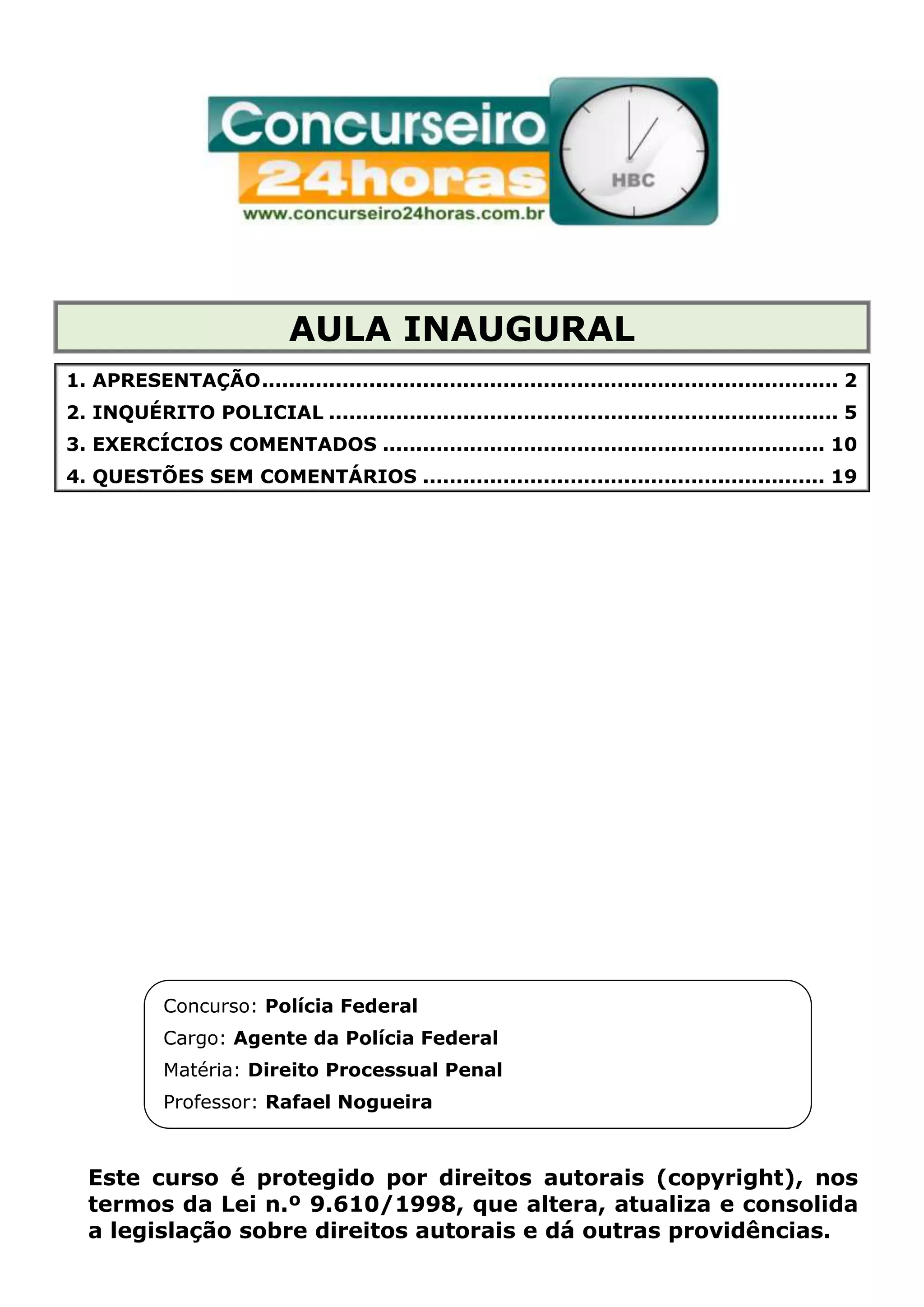 O documento apresenta um curso de direito processual penal voltado para a preparação do concurso de agente da Polícia Federal, com foco na legislação e metodologias que facilitam a aprovação dos candidatos. O professor Rafael Nogueira destaca a importância de uma preparação prévia e oferece suporte para os alunos durante o processo de estudo. Além disso, o conteúdo programático aborda temas relevantes sobre o inquérito policial e seus procedimentos, essenciais para o desempenho na função.
