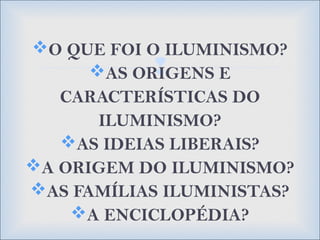 O Iluminismo foi um movimento intelectual do século 18 na Europa que defendia o uso da razão contra o antigo regime, pregando maior liberdade. Grandes pensadores iluministas acreditavam que suas ideias de liberdade política e econômica poderiam guiar os governantes. A Enciclopédia resumiu as ideias iluministas de valorização da razão, ciência e crítica à Igreja e ao absolutismo.