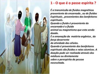 O documento discute o que é o passe espírita, que é a transmissão de fluidos magnéticos ou espirituais de encarnados ou espíritos para auxiliar na harmonização física e psíquica da pessoa. O passe pode ser transmitido pelas mãos, sopro ou à distância e depende da vontade e condição do doador. O passista deve evitar vícios e estar equilibrado para transmitir fluidos benéficos.
