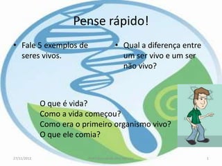 Este documento discute as principais hipóteses sobre a origem da vida, incluindo o criacionismo, a panspermia e a teoria da abiógênese. Apresenta a teoria moderna da evolução química defendida por Oparin e Miller, que sugere que a vida surgiu espontaneamente pela combinação química de substâncias, formando materiais cada vez mais complexos. Também fornece recomendações adicionais para aprofundar o tema.