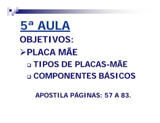 Este documento fornece uma introdução aos principais componentes de uma placa-mãe, incluindo tipos de placas-mãe, formatos, fabricantes e componentes básicos como barramento, frequência, chipset e slots. Ele também discute os diferentes tipos de soquetes de processador e recursos on-board comuns.