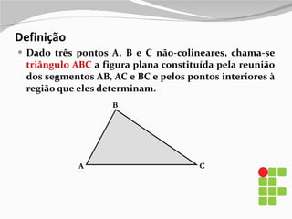 1) O documento apresenta os diferentes tipos de triângulos classificados de acordo com a medida de seus lados e ângulos internos.