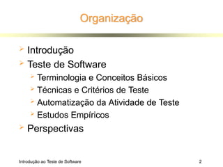 O documento apresenta uma introdução abrangente à verificação, validação e teste de software, destacando conceitos fundamentais como qualidade, confiabilidade e as técnicas aplicadas ao processo de teste. São discutidas as atividades de teste, métricas de avaliação, e a importância da automatização no desenvolvimento do software, além de técnicas funcionais e estruturais. A documentação enfatiza a necessidade de planejamento e execução adequados dos testes para garantir a correção e qualidade do software ao longo de seu ciclo de vida.