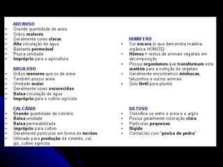 O documento descreve 5 tipos de solos com base em sua composição e características: 1) Solos arenosos contêm muita areia, drenam bem mas retêm pouca umidade; 2) Solos argilosos contêm partículas menores que a areia, retêm mais umidade mas drenam pior; 3) Solos húmicos são escuros e férteis devido à matéria orgânica; 4) Solos calcários contêm muito calcário e são impropriados para cultivo; 5) Solos silicosos situam-se entre are