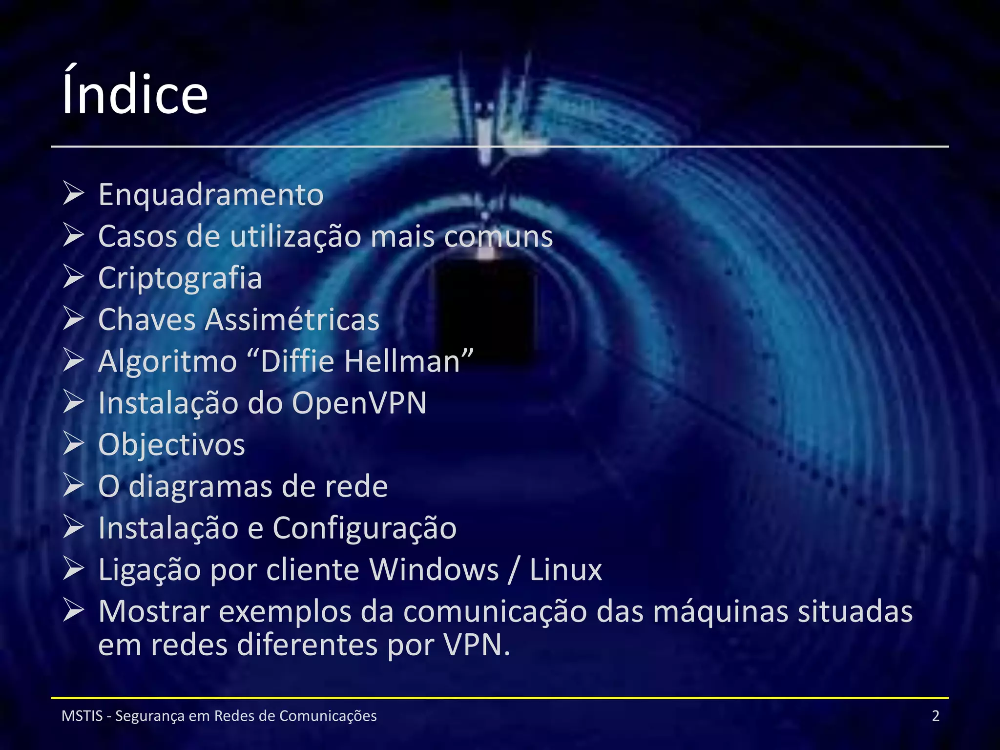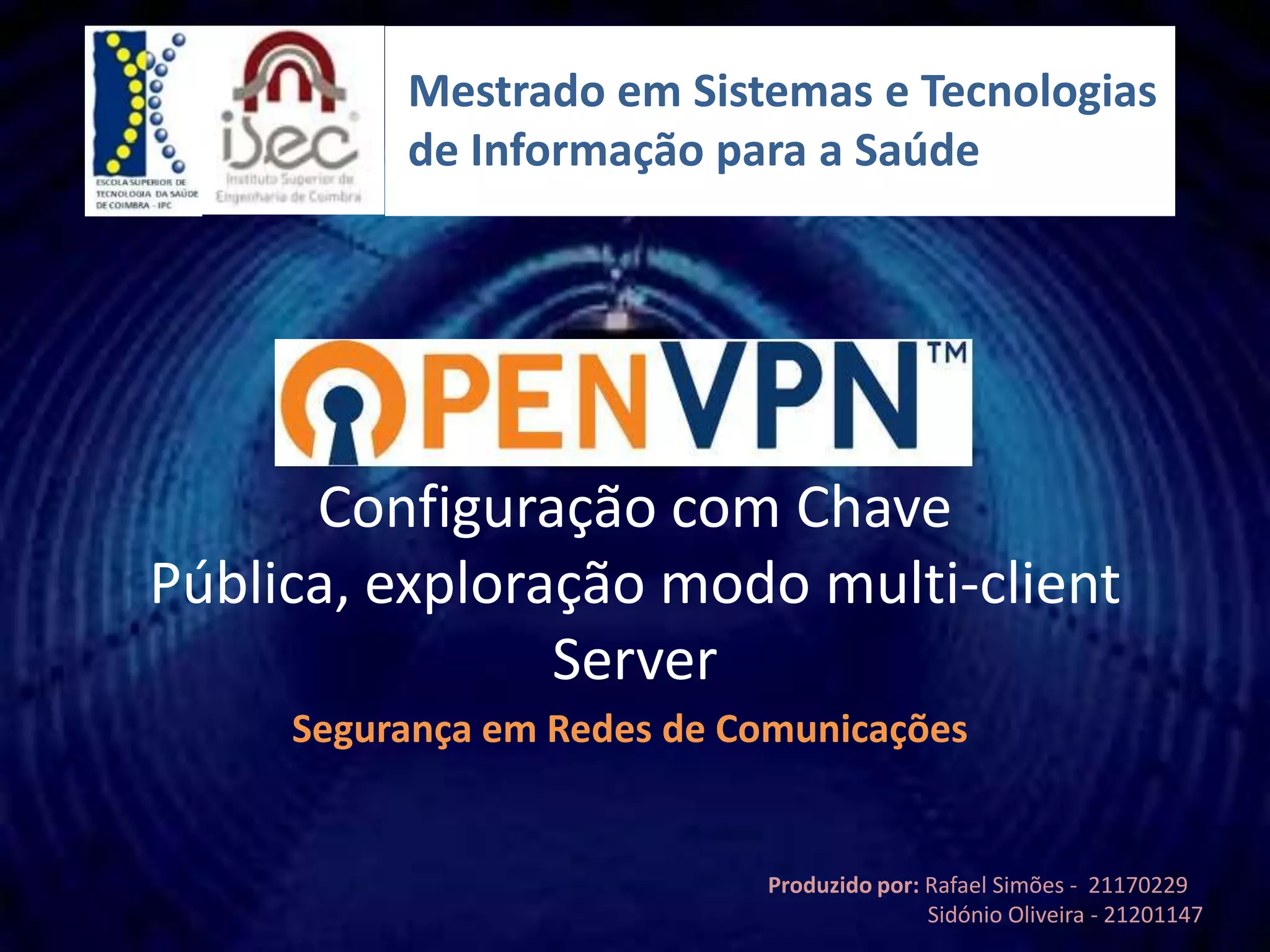 Este documento descreve o processo de configuração de uma rede privada virtual (VPN) usando o OpenVPN para fornecer comunicações seguras entre redes. Ele discute a instalação e configuração do servidor e clientes OpenVPN em sistemas Linux e Windows, a geração de certificados digitais e a autenticação de chaves públicas para estabelecer uma conexão VPN segura.