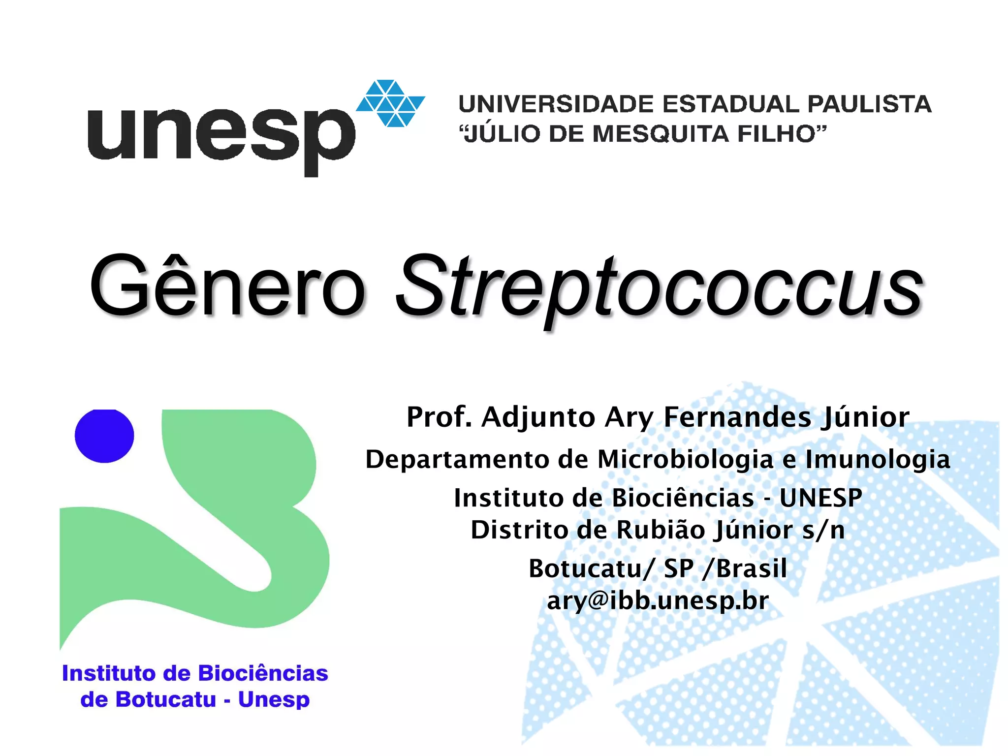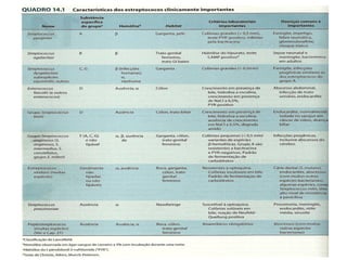 Este documento fornece informações sobre a classificação, características e importância médica do gênero Streptococcus. O documento descreve os 11 principais grupos de Streptococcus, com ênfase no grupo A (S. pyogenes), incluindo seus fatores de virulência, patogenicidade e doenças associadas como a escarlatina e febre reumática.