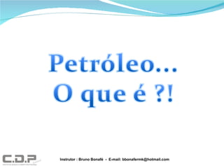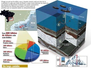 O documento descreve o que é petróleo, sua origem e como é extraído e refinado. Explica que o petróleo é formado pela decomposição de matéria orgânica sob altas pressões e temperaturas ao longo de milhões de anos, e é encontrado em rochas sedimentares. Também aborda a história do petróleo, o mercado de trabalho no setor, o Comperj e a camada pré-sal no Brasil.