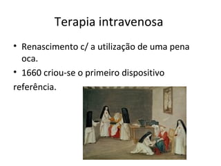 O documento fornece informações sobre a terapia intravenosa, resumindo sua história desde o século XVII, técnicas atuais e responsabilidades dos profissionais de enfermagem. Aborda os tipos de cateteres, materiais, indicações, técnicas de inserção e manutenção conforme protocolos de segurança.