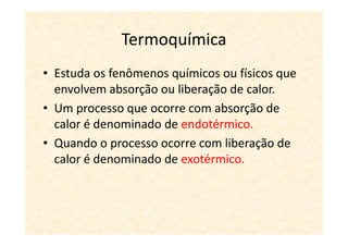 A termoquímica estuda processos químicos e físicos que envolvem absorção ou liberação de calor. Processos endotérmicos absorvem calor e processos exotérmicos liberam calor. A variação de entalpia (ΔH) de uma reação depende dos estados físicos iniciais e finais e é igual ao calor absorvido ou liberado.