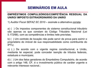 O documento discute tributos federais como empréstimos compulsórios, competência residual da União e imposto extraordinário da União. Resume questões sobre esses tributos em seminários para concursos públicos e discute conceitos como alíquotas progressivas no Imposto sobre Grandes Fortunas.