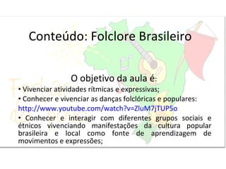 A aula teve como objetivo vivenciar atividades rítmicas e expressivas relacionadas ao folclore brasileiro, conhecer danças folclóricas e populares e interagir com diferentes grupos sociais e étnicos. Os alunos participaram de atividades individuais e em grupo, pesquisas, confecção de cartazes e apresentações sobre o folclore para a escola. A avaliação considerou a participação dos alunos e a apresentação de seu trabalho para a comunidade.