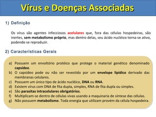 O documento discute vírus e doenças associadas, definindo vírus, suas características, estrutura, reprodução e principais doenças causadas. Aborda os ciclos de reprodução viral, tipos de vírus como HIV e hepatites, sintomas e formas de prevenção de doenças como herpes e hepatite A.