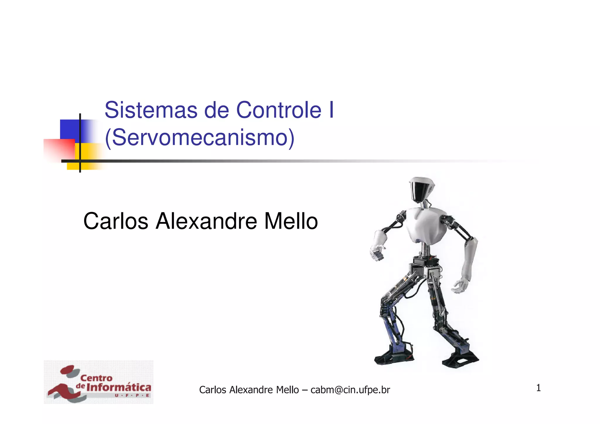 O documento discute sistemas de controle. Primeiramente, define um sistema de controle como um conjunto de componentes organizados para obter uma resposta desejada de um sistema. Em seguida, descreve os principais elementos de um sistema de controle, incluindo planta, controlador, atuador e sensor. Por fim, classifica os sistemas de controle de acordo com sua estrutura em malha aberta e malha fechada.