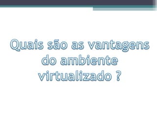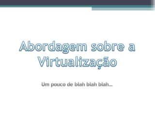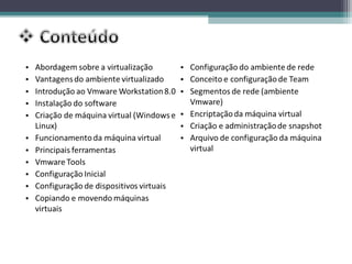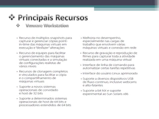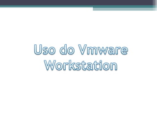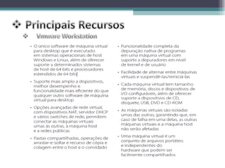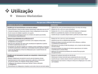 O documento discute a técnica da virtualização, permitindo particionar um único sistema computacional em vários outros denominados máquinas virtuais. A virtualização melhora a utilização dos ativos e os torna mais eficientes, além de diminuir custos e melhorar a qualidade dos serviços. O VMware Workstation é um software de virtualização para desktops que fornece uma interface gráfica completa e fácil de usar.