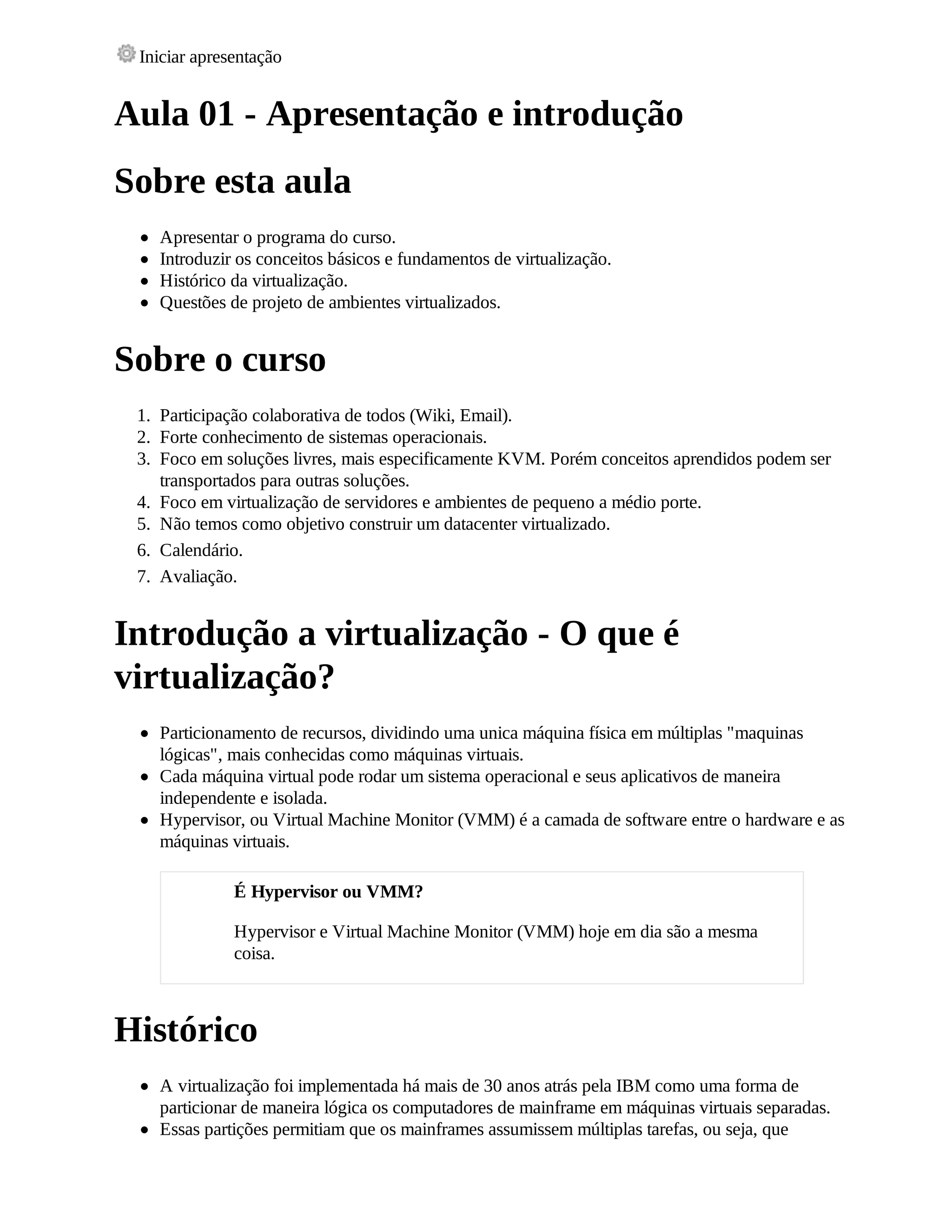 Esta aula apresenta o programa do curso sobre virtualização, introduz conceitos básicos como particionamento de recursos em máquinas virtuais e histórico da virtualização em mainframes e servidores x86. Também discute técnicas de virtualização como completa, paravirtualização e assistida por hardware, além de motivações e desafios da virtualização como aumento da utilização de recursos e consolidação de servidores.