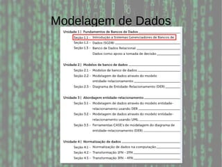 O documento apresenta um curso de modelagem de dados ministrado pelo professor Eduardo Pereira. A partir de 23/08, as aulas ocorrerão no Laboratório de Informática 2 utilizando o software MySQL Workbench. Os tópicos abordados incluem dados, informação, geração de conhecimento, Internet das Coisas e singularidade tecnológica.