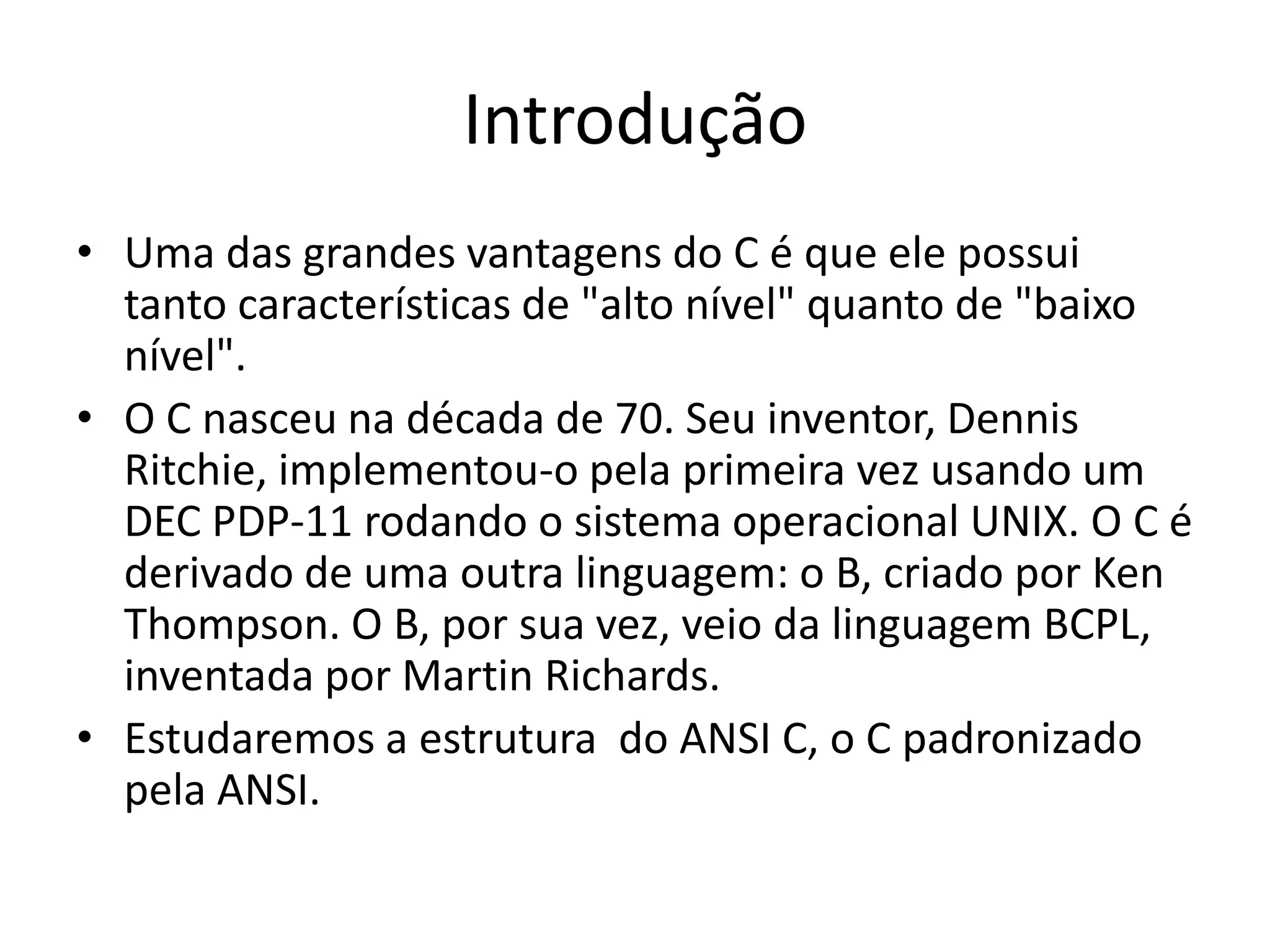 O documento apresenta um resumo de 5 aulas sobre a linguagem de programação C. A primeira aula introduz conceitos básicos como variáveis, constantes, operadores e expressões. A segunda aula aborda estruturas de controle de fluxo e arrays. A terceira aula trata de ponteiros e funções. A quarta aula discute diretivas de compilação e entrada/saída padronizada. A quinta e última aula apresenta tópicos avançados como tipos de dados definidos pelo usuário.