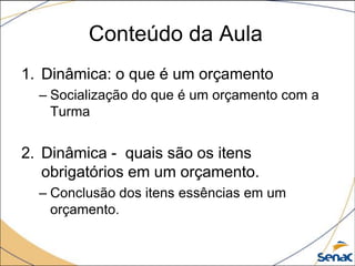 O documento discute a dinâmica de um curso sobre orçamento e compras de hardware, definindo orçamento como um plano financeiro estratégico e identificando itens essenciais em um orçamento como planejamento de compra de peças e serviços.